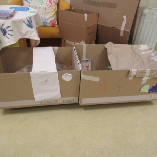 Was ein kleiner Aushang bewirken kann!! Diesen Monat bat ich die Eltern uns bei der Beschaffung von Bastelmaterial für unsere Bastelecke zu helfen. Schachteln, Kartons, Rollen und was sonst so anfällt im Alltag. Unser Korb vor der Garderobe füllte sich und eines Tages brachte uns eine Mama große Kartons von der Arbeit mit! Sofort wurden sie von den Kindern in Beschlag genommen, Pläne gezeichnet, beklebt, bemalt und zu Autos, Bussen, Robotern, Häusern und Betten umfunktioniert. Aus anfänglich zwei Kartons wurden nun immer mehr, plötzlich sah unser Eingangsbereich und der Bereich vor unserem Gruppenraum aus, als würden wir einen Umzug planen. Aber die Kinder waren eifrig am Arbeiten und am Spielen und der „Schachtelfunke“ griff auch auf die Nachmittagskinder über! So sind wir nun gespannt, wie es weitergeht!