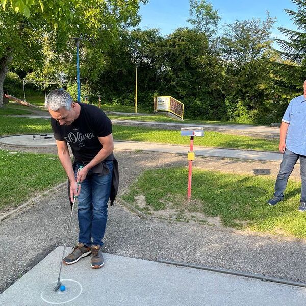 Männerrunde MiniGolf 20.05.2025 18:00 Die Ebelsberger Männerrunde spielte MiniGolf im Lissfeld-Park. Zum Abschluss gabe es eine große Pizza.