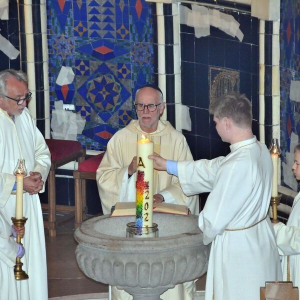 Die Auferstehungsfeier am Karsamstag begann am Kirchenplatz mit der Feuerweihe und dem Entzünden der Osterkerze. Das Osterfeuer entzündeten traditionell die Pfadfinder. Musikalisch wurde die Feier vom RhythmusChor gestaltet. Die im Gottesdienst geweihten Speisen wurden anschließend im Pfarrzentrum in geselliger Runde verzehrt.