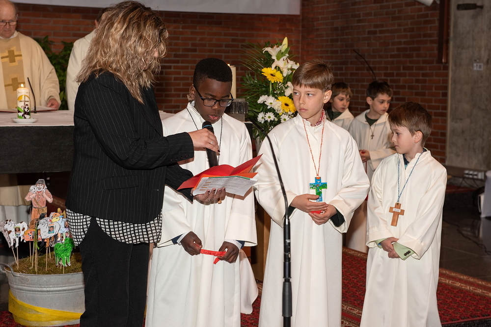 Bei der Predigt erschien ein besonderer Gast, die Eselin Friedericke. Gemeinsam mit Diakon Herbert berichtete sie vom Einzug Jesu in Jerusalem und erklärte, was es mit der Kommunion auf sich hat.