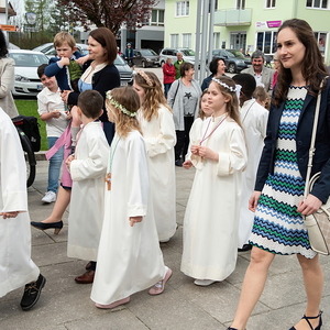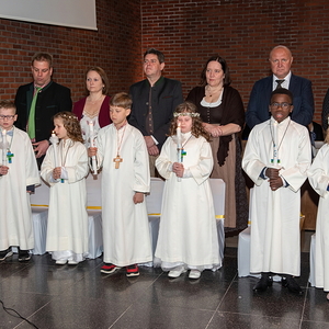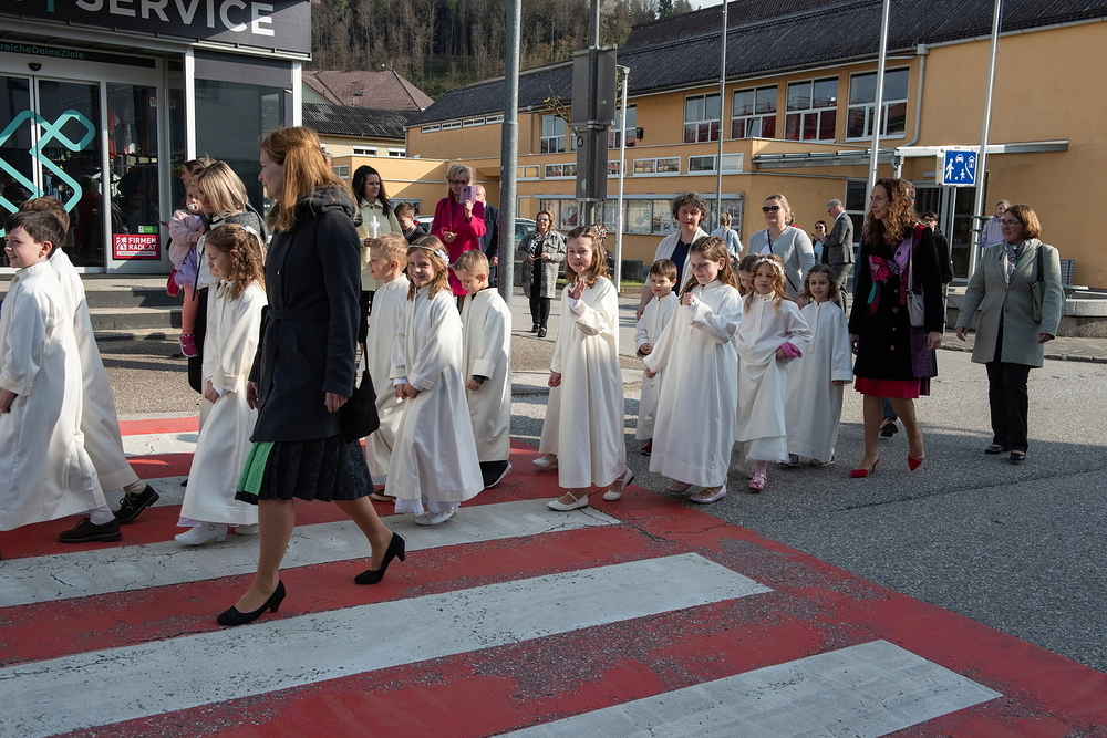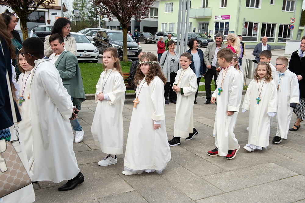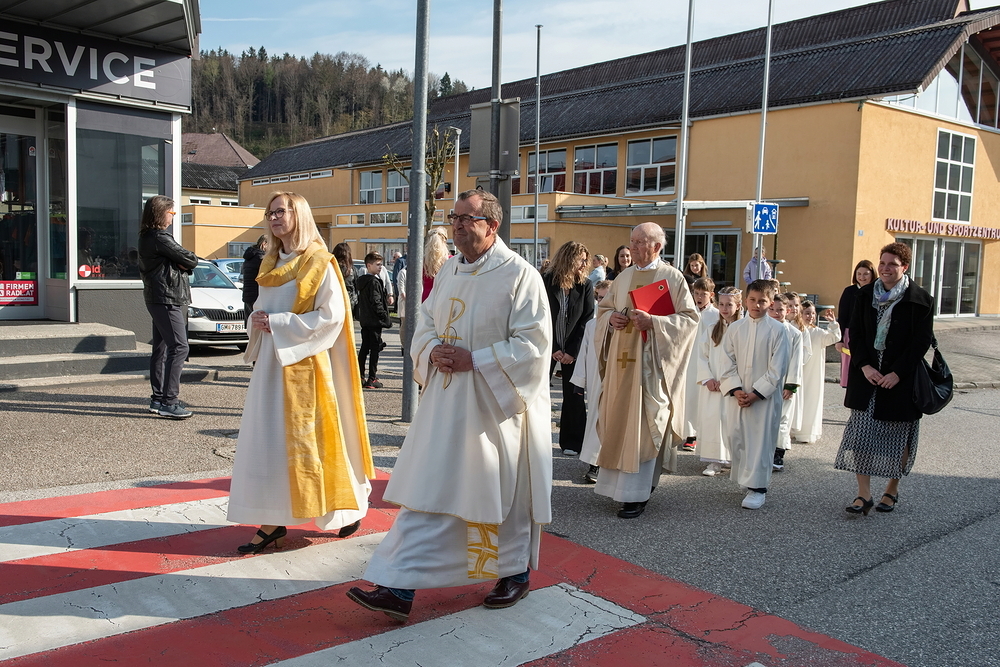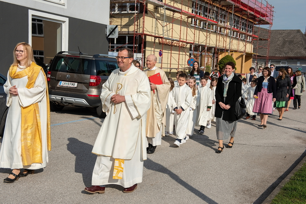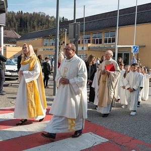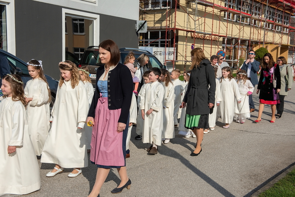 Pater Franz Kniewasser, Diakon Herbert und Pfarrleiterin Sabine schlossen mit den Ministranten die feierliche Prozession ab und zogen gemeinsam mit den Kindern in die festlich geschmückte Pfarrkirche ein.