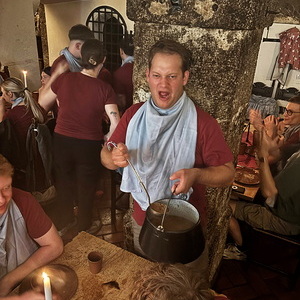 Gleich am ersten Abend wartete ein ganz besonderes Highlight auf uns: ein mittelalterliches Ritteressen in Hall. Drei von uns wurden dort feierlich zu Ritter, Hofnarr und Barde geschlagen – sehr zur Freude des gesamten Saals.