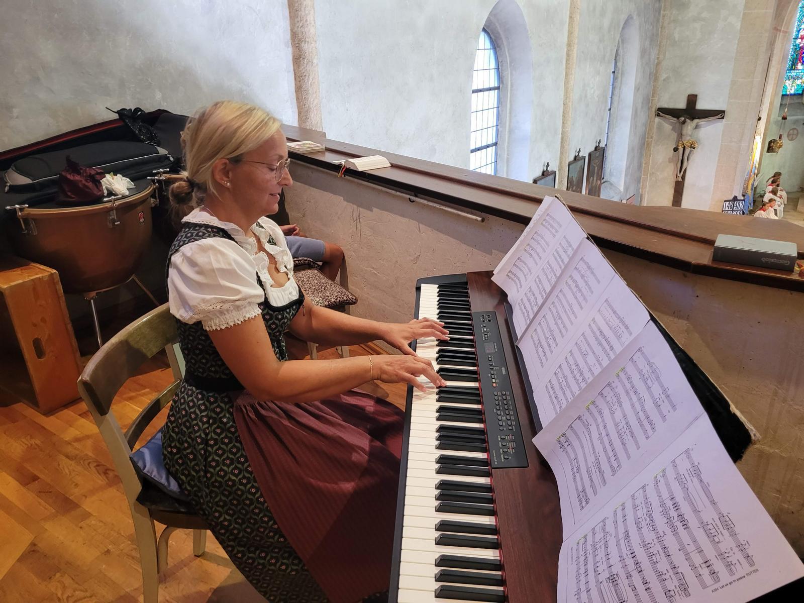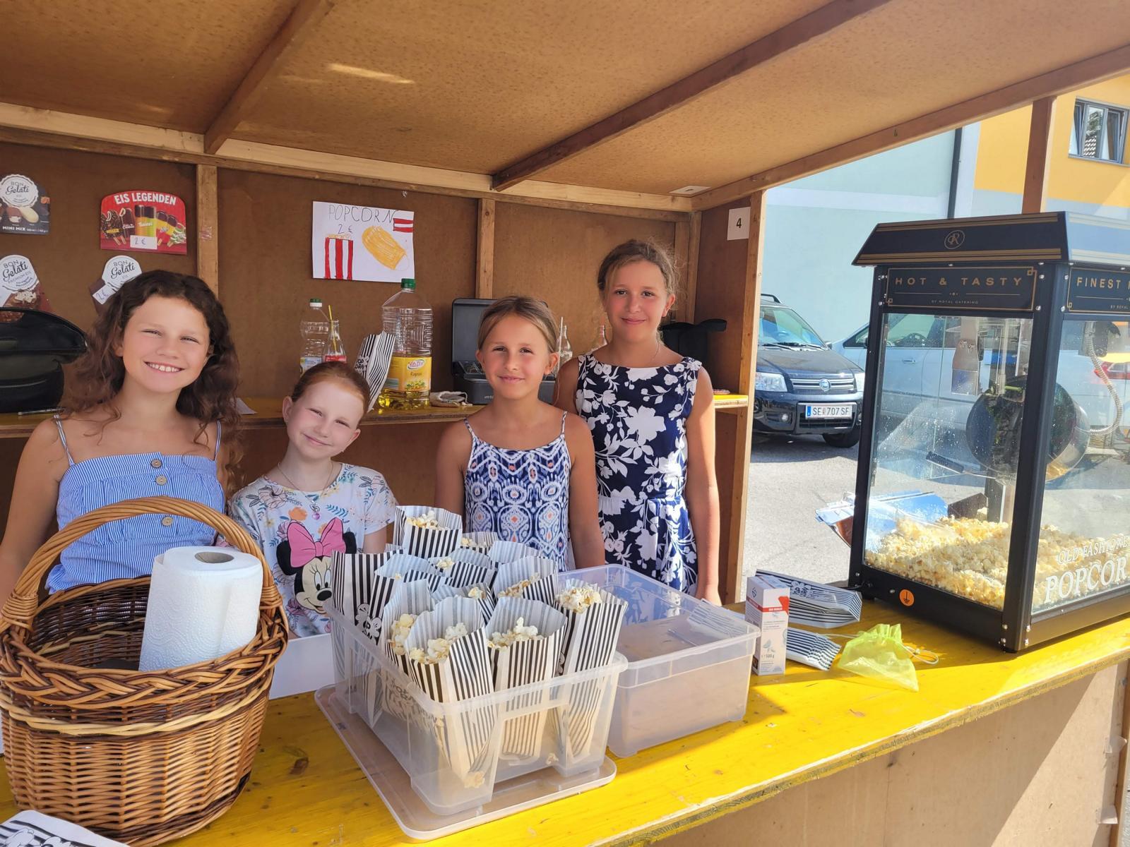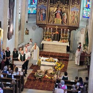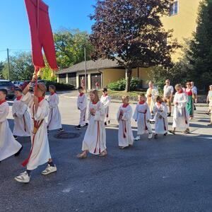 Der Kirchenchor gestaltete mit schwungvollen rhythmischen Gesängen den Festgottesdienst, bei dem die Gabenkörbe von den Vereinen und Gruppen zum Altar getragen wurden. Mit dem Te Deum, Großer Gott, wir loben Dich endete der Gottesdienst. Die Spenden kommen der Bezahlung der erneuerten Fenster des Pfarrheimes zugute. Kirchliche Organisationen hatten auch einen Stand beim Kirtag, wie die Jungschar und Ministranten mit Popkorn, der Sozialkreis und Mary´s Meals mit nützlichen Kleidungsstücken.