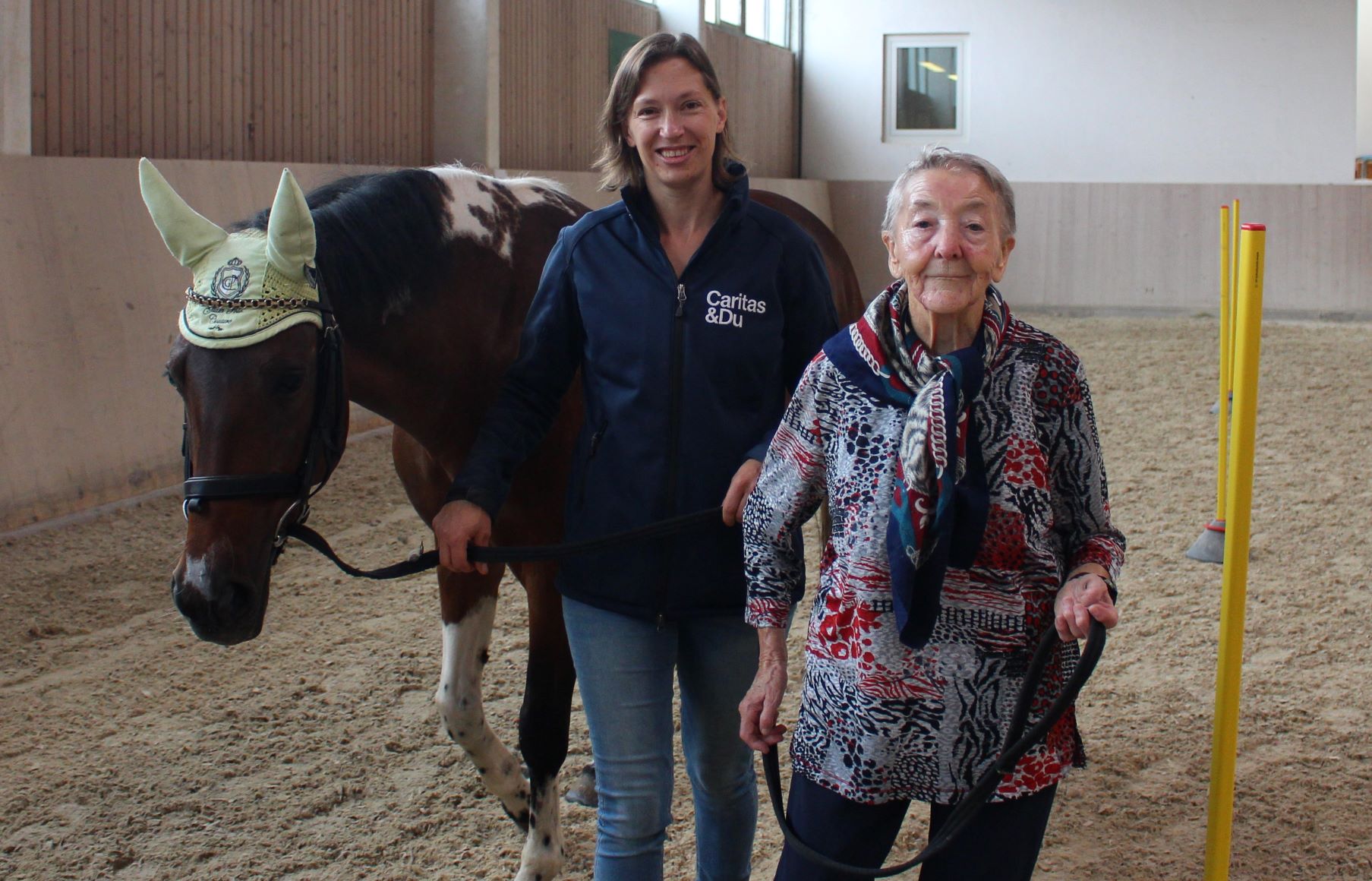 Die beiden Caritas-Reitpädagoginnen Christina Pernecker und Corinne Cazes erwarteten die Senior:innen und gingen mit ihnen zuerst eine Runde durch den Stall und erklärten: „Pferde sind sehr feinfühlige Lebewesen. Sie spüren, wie sich ein Mensch fühlt. Ist jemand angespannt, so schaffen sie es meist durch ihr Verhalten, dass sich die Leute rasch entspannen.“