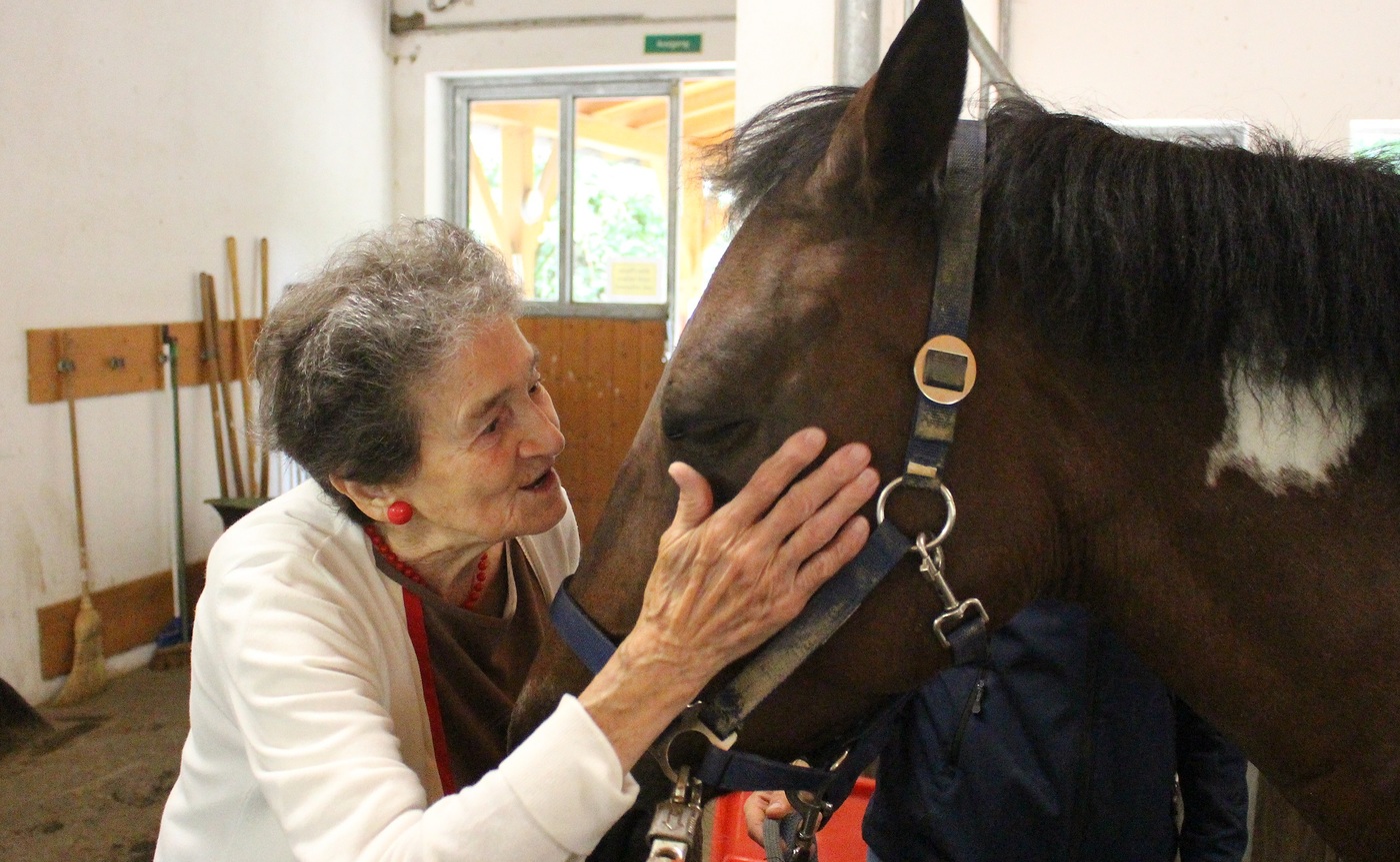 Zwei der Pferde sind die Stuten Lizzi und Farbenfroh. Die weiße Lissi hat es sofort Anna Gratzl angetan: „Du bist eine Hübsche, und so weich.“ Als sie eine Bürste bekam, war sie nicht mehr zu halten. Von Kopf bis Fuß striegelte die 81-Jährige die Schimmelstute, bis diese glänzte. Mit Unterstützung der Reitpädagogin wurden anschließend noch die Hufe ausgekratzt. Auch die Stute Farbenfroh ließ sich geduldig von den Senior*innen streicheln und striegeln.